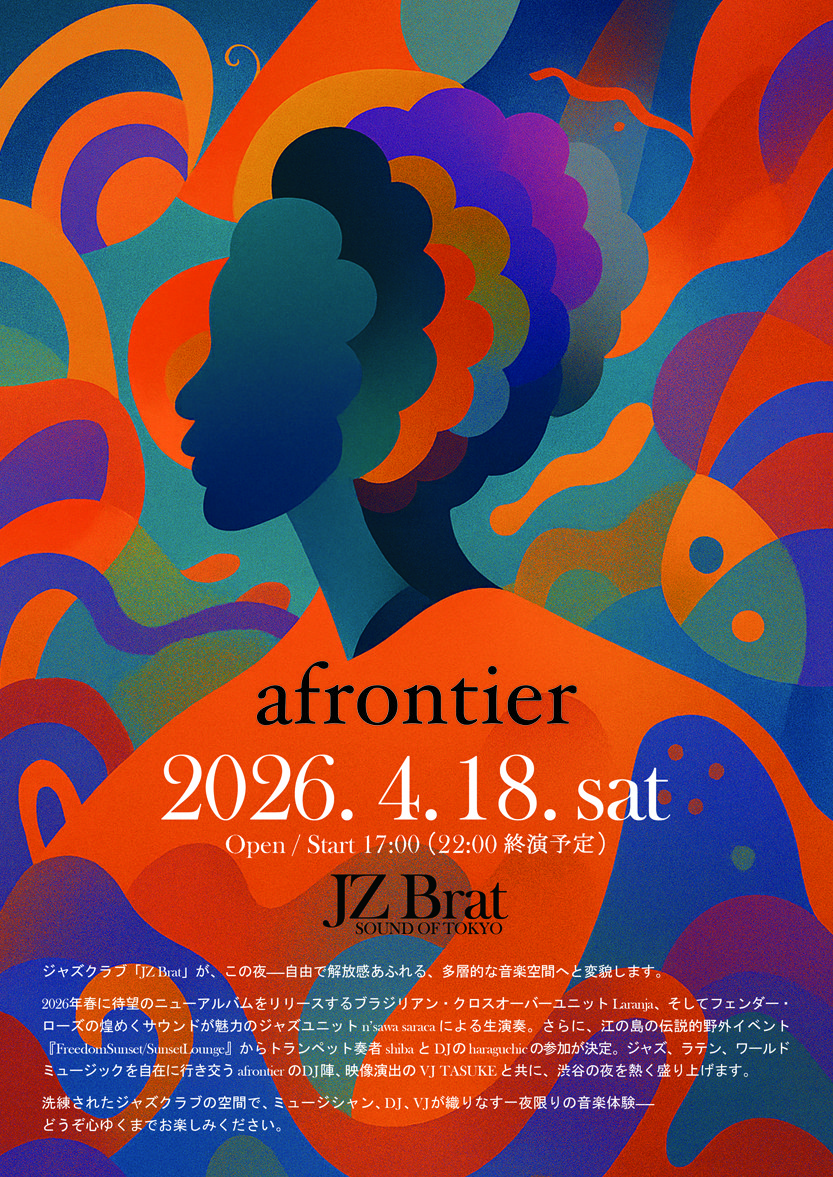 ジャズ、ラテン、ワールドミュージックを自在に行き交う afrontier のDJ陣、映像演出の VJ TASUKEと共に、渋谷の夜を熱く盛り上げます。
